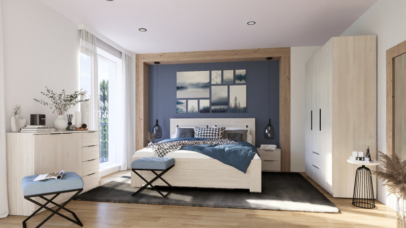 - Všechno na jednom místě: postele (jednolůžkové postele 90×200 i manželské postele 180×200 a 140×200), lamelové rošty, matrace AHORN, noční stolky (včetně vysokých nočních stolků k vyšším postelím), komody a šatní skříně se posuvnými dveřmi.