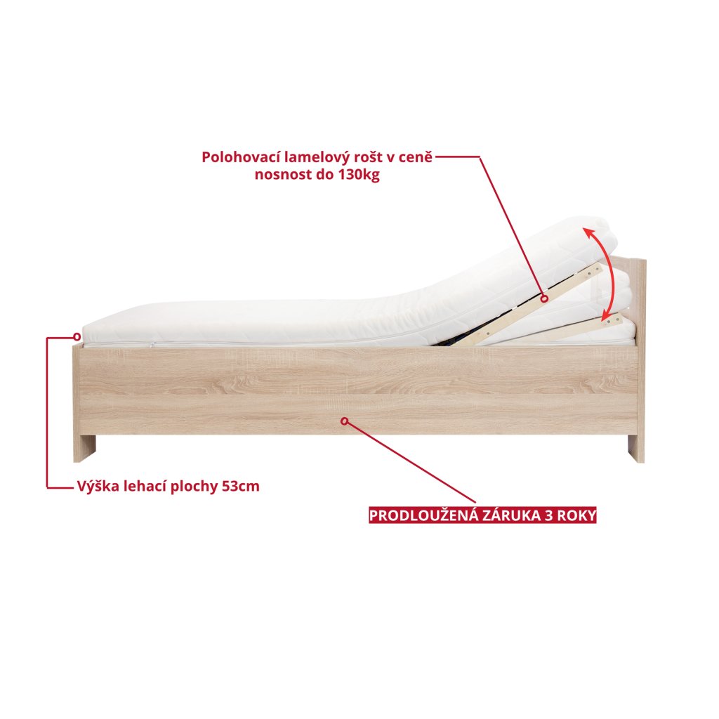 Součástí je kvalitní lamelový polohovací rošt s možností nastavení tuhosti v bederní části pro váš ideální spánek.